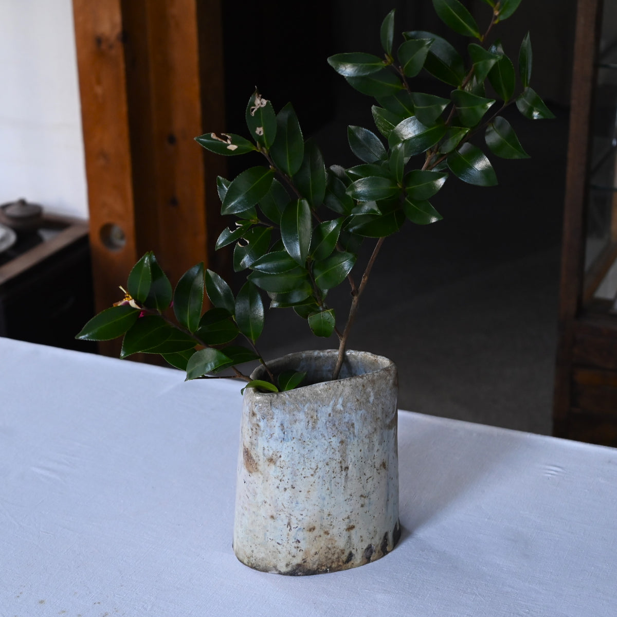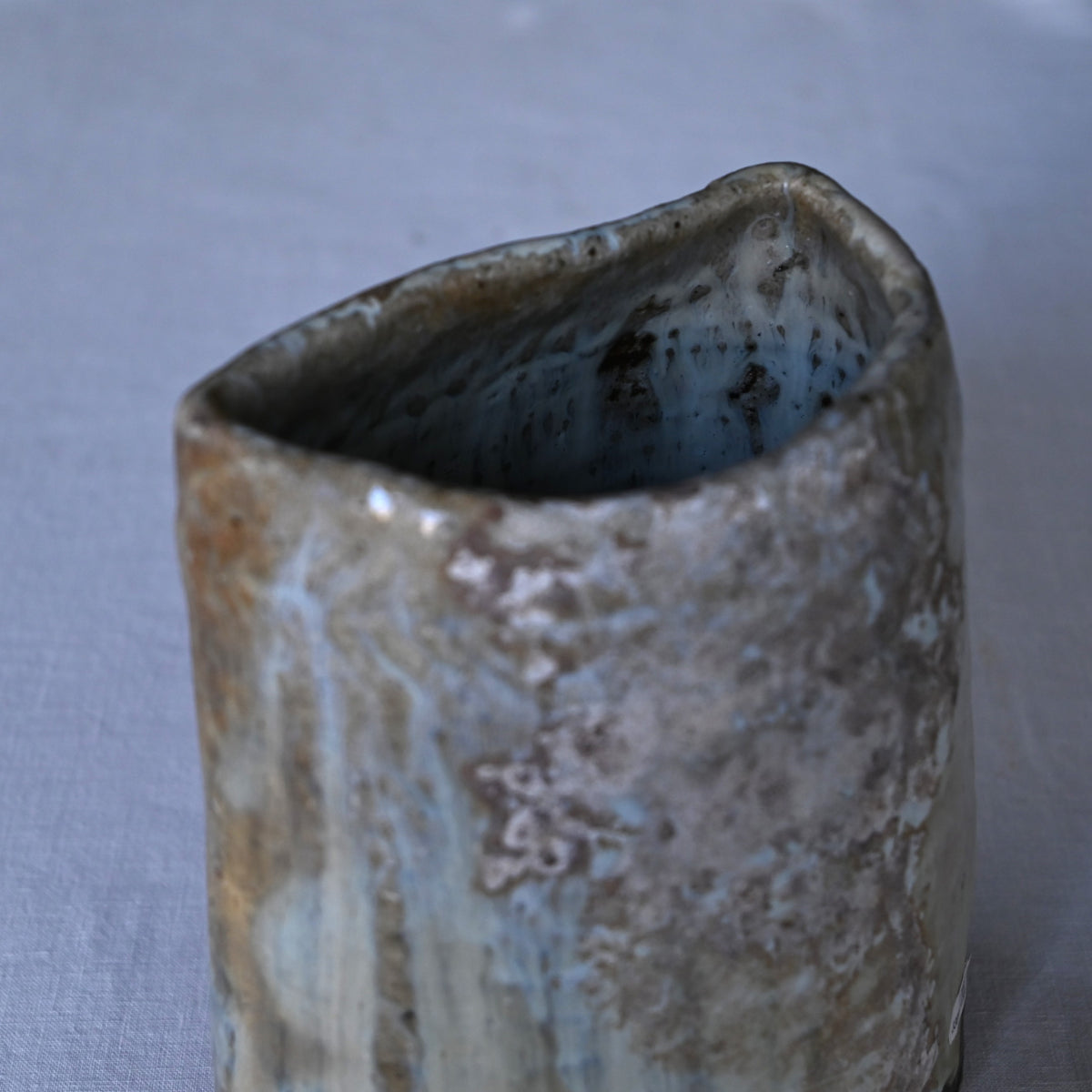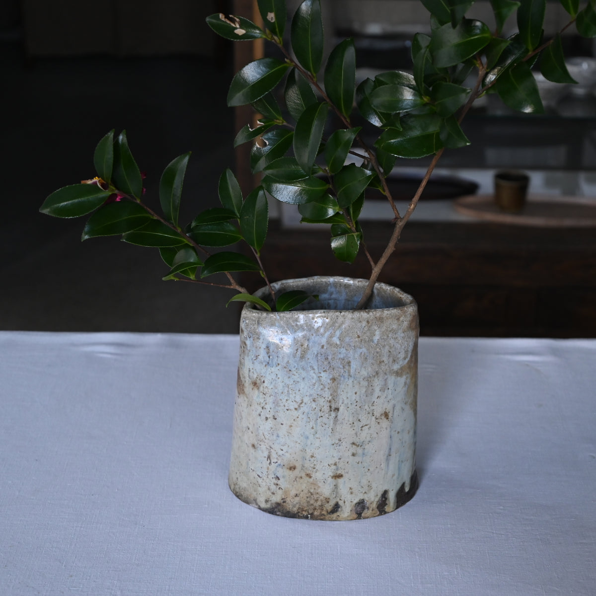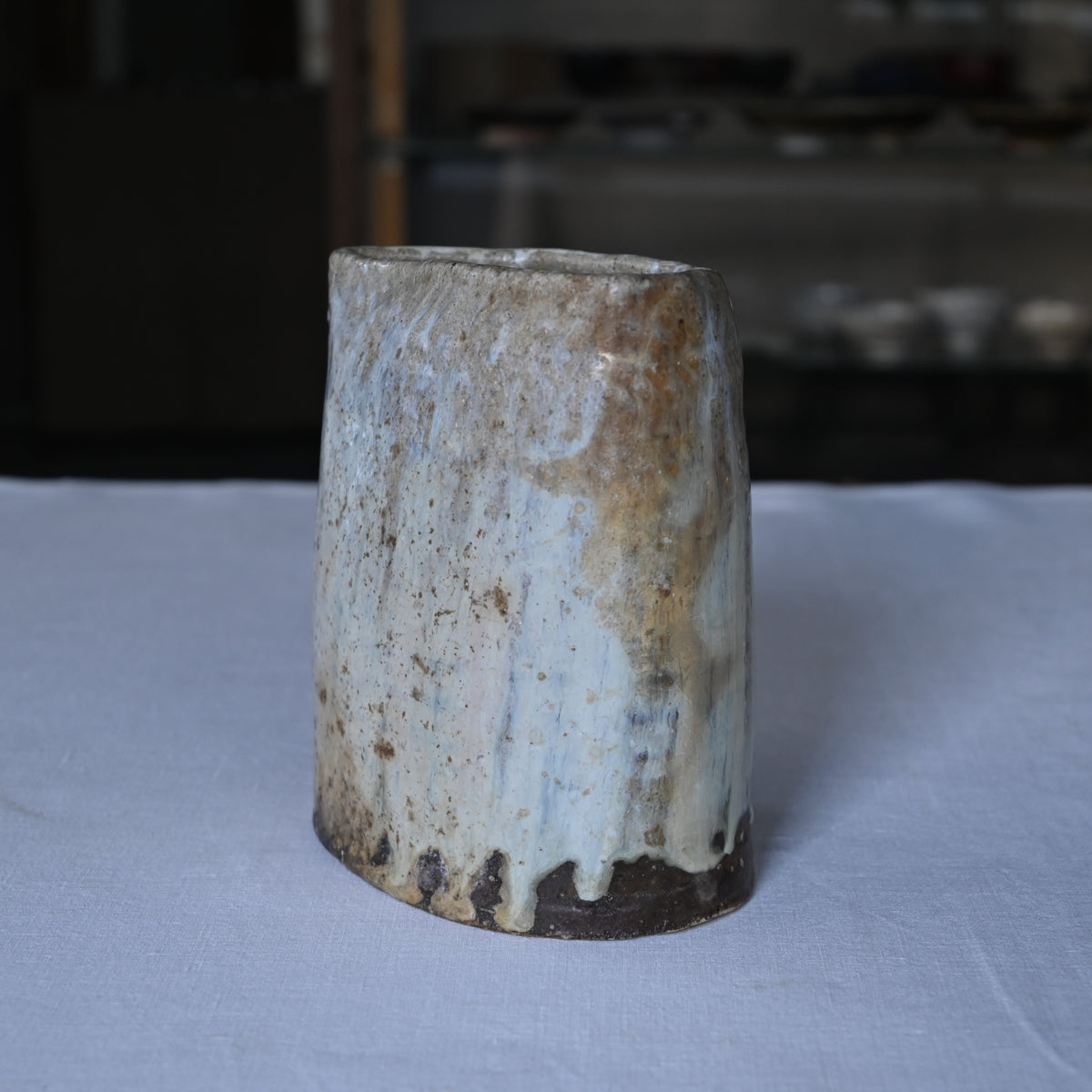 流れ落ちる釉薬の躍動感や力強さ、その中ゆがみなどからやさしくあたたかな空気を纏う花入。