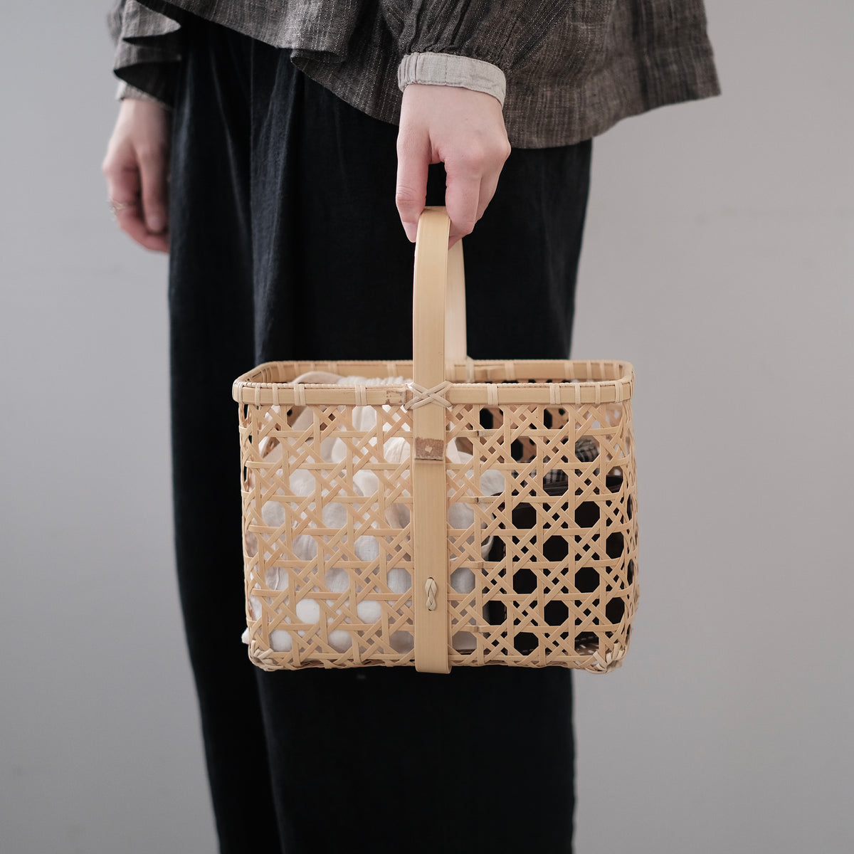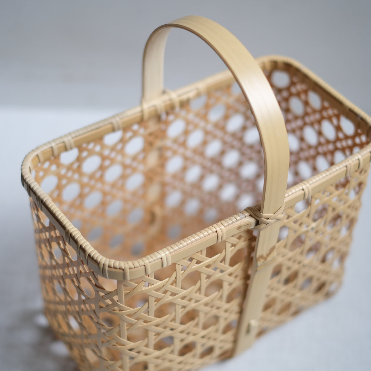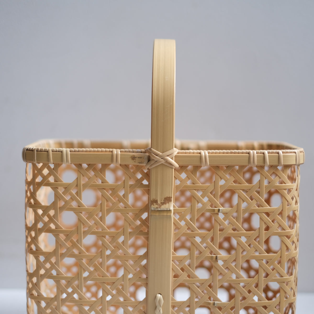 八つ目バスケットは持ち手が四角いのに対して、八つ目バッグの持ち手は幅のある竹を丸い曲線に曲げることで、腕に添いやすくなっています。