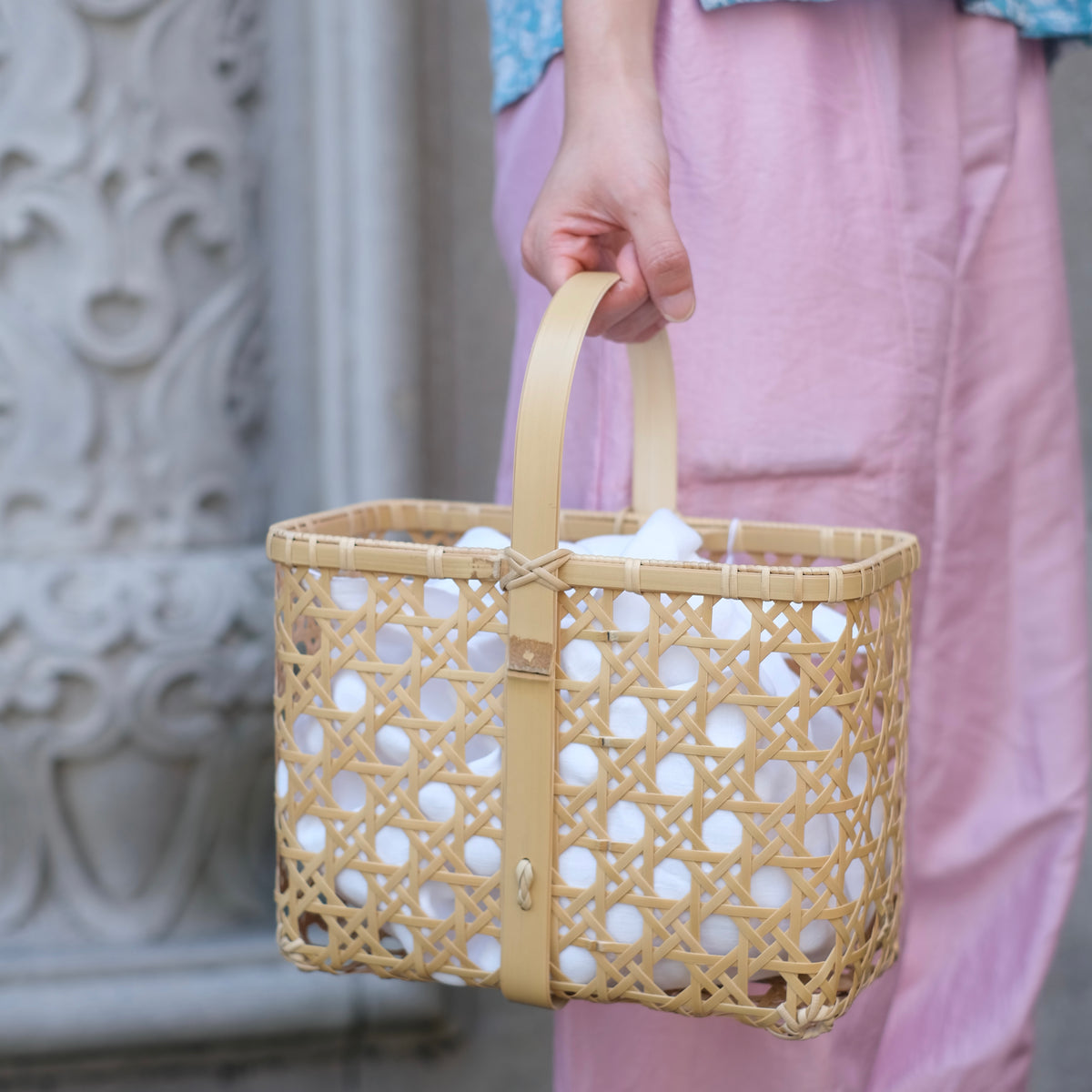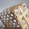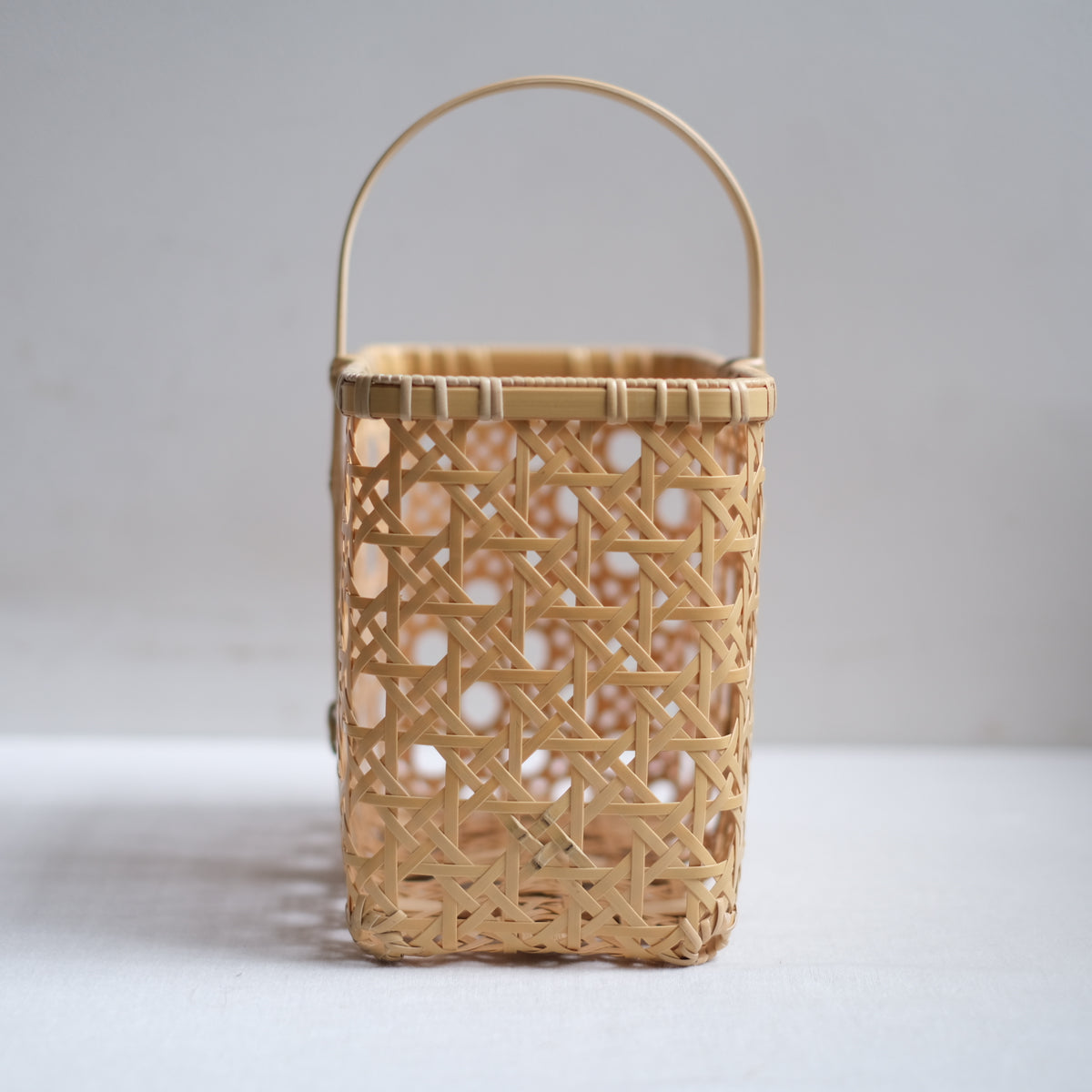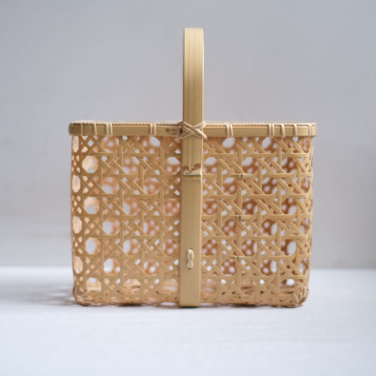八つ目バスケットは持ち手が四角いのに対して、八つ目バッグの持ち手は幅のある竹を丸い曲線に曲げることで、腕に添いやすくなっています。