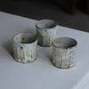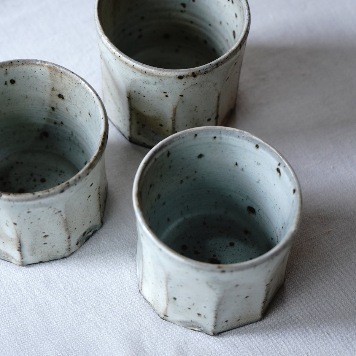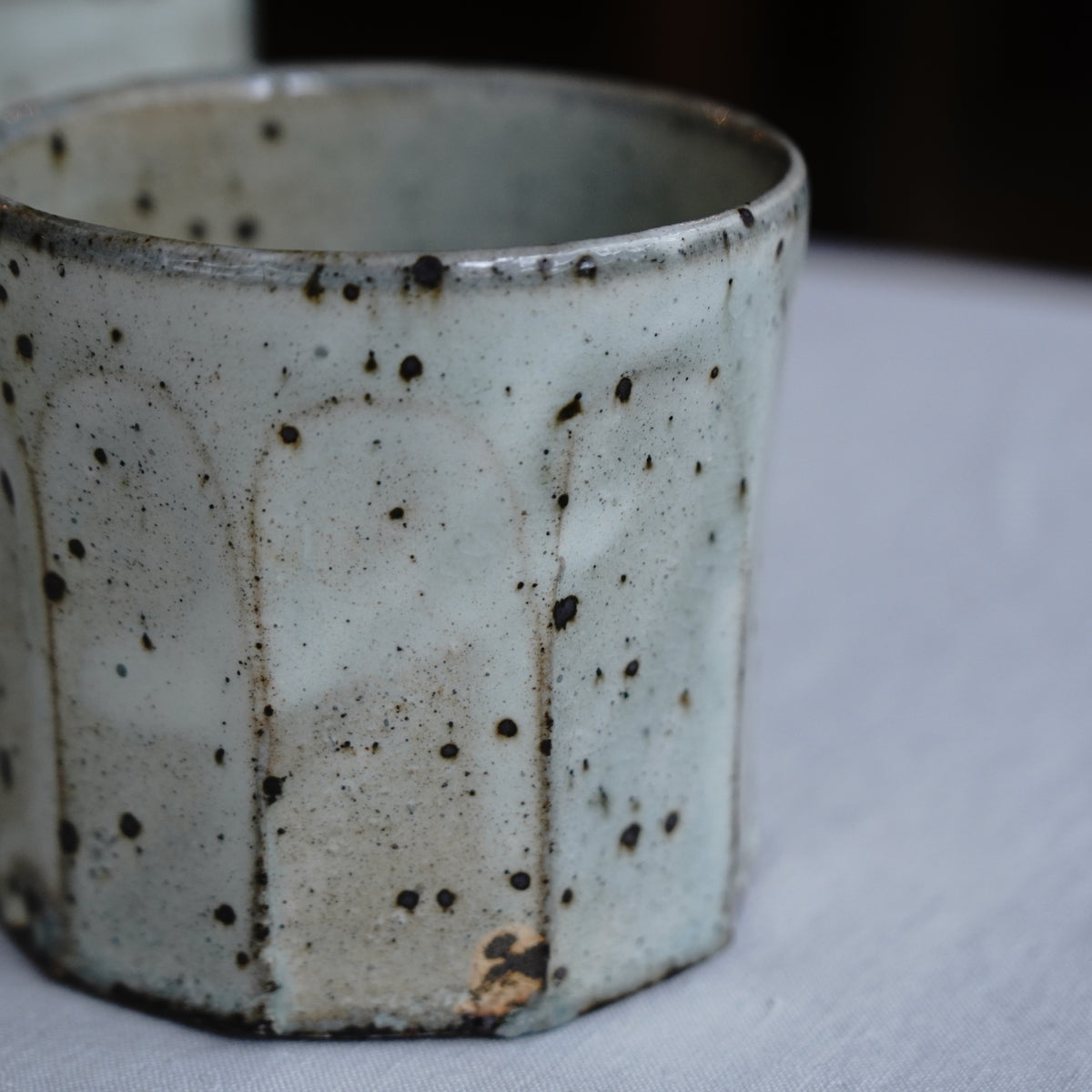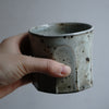 白化粧と釉薬のうねりが美しい粉引の面取りカップ。