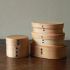 樹齢150~200年の天然秋田杉を使った曲げわっぱのお弁当箱。小判型3サイズと二つ重ね丸の4種です。