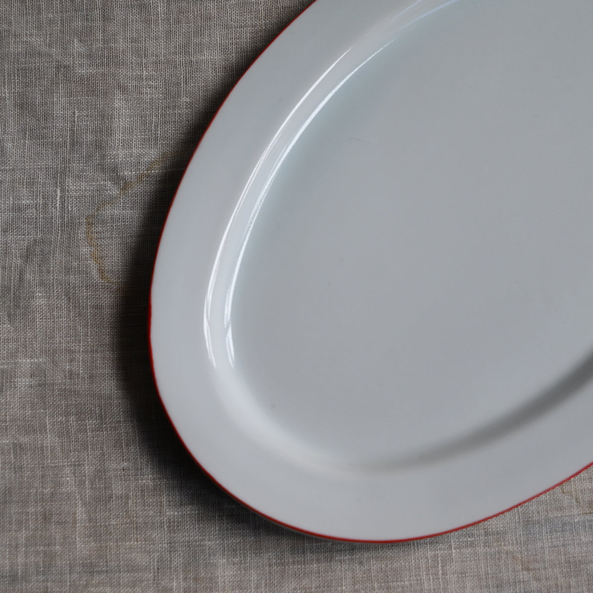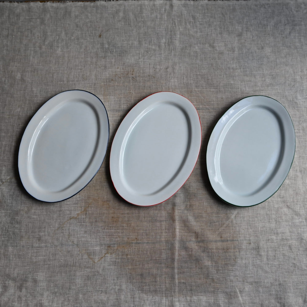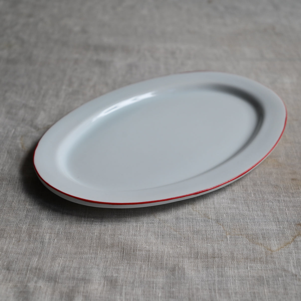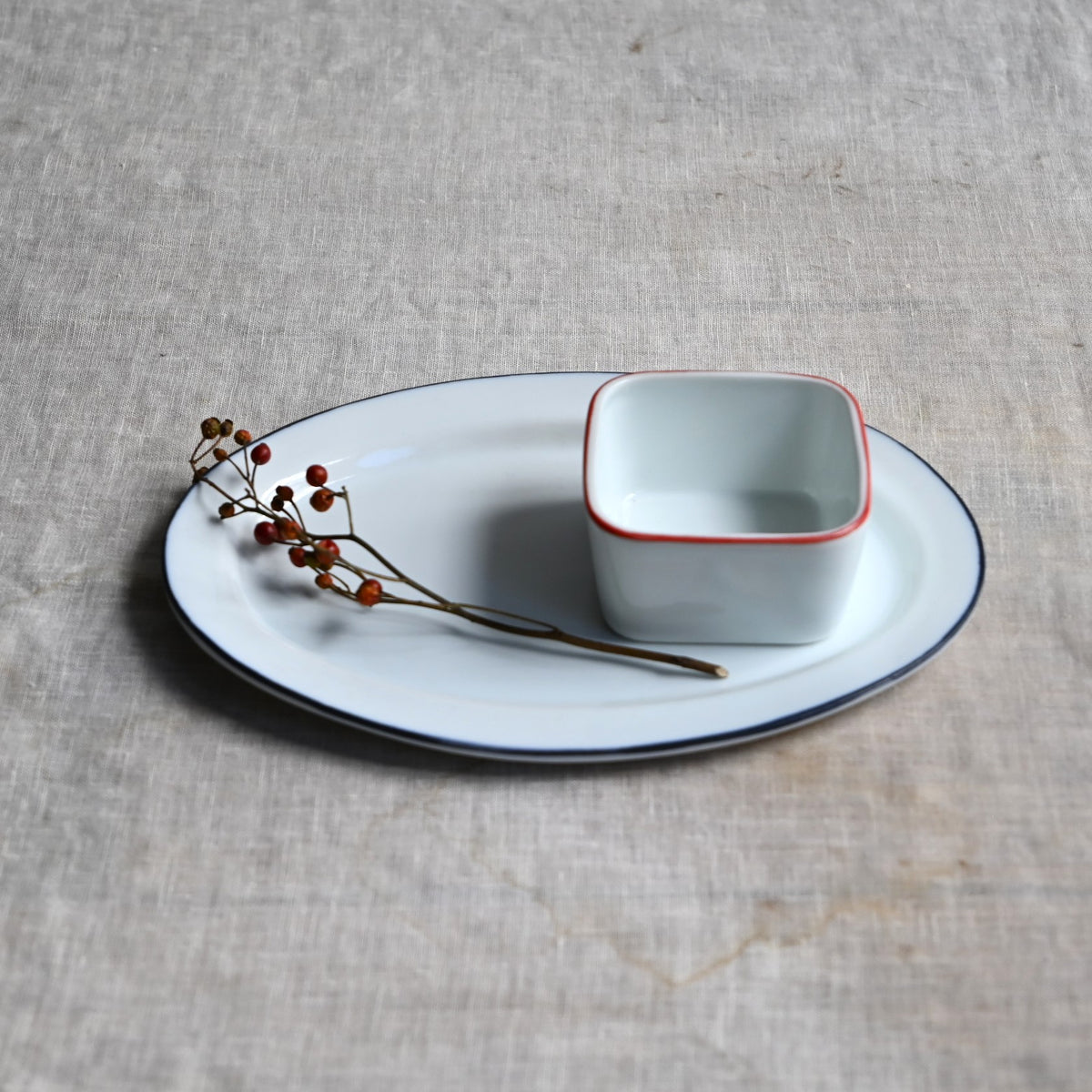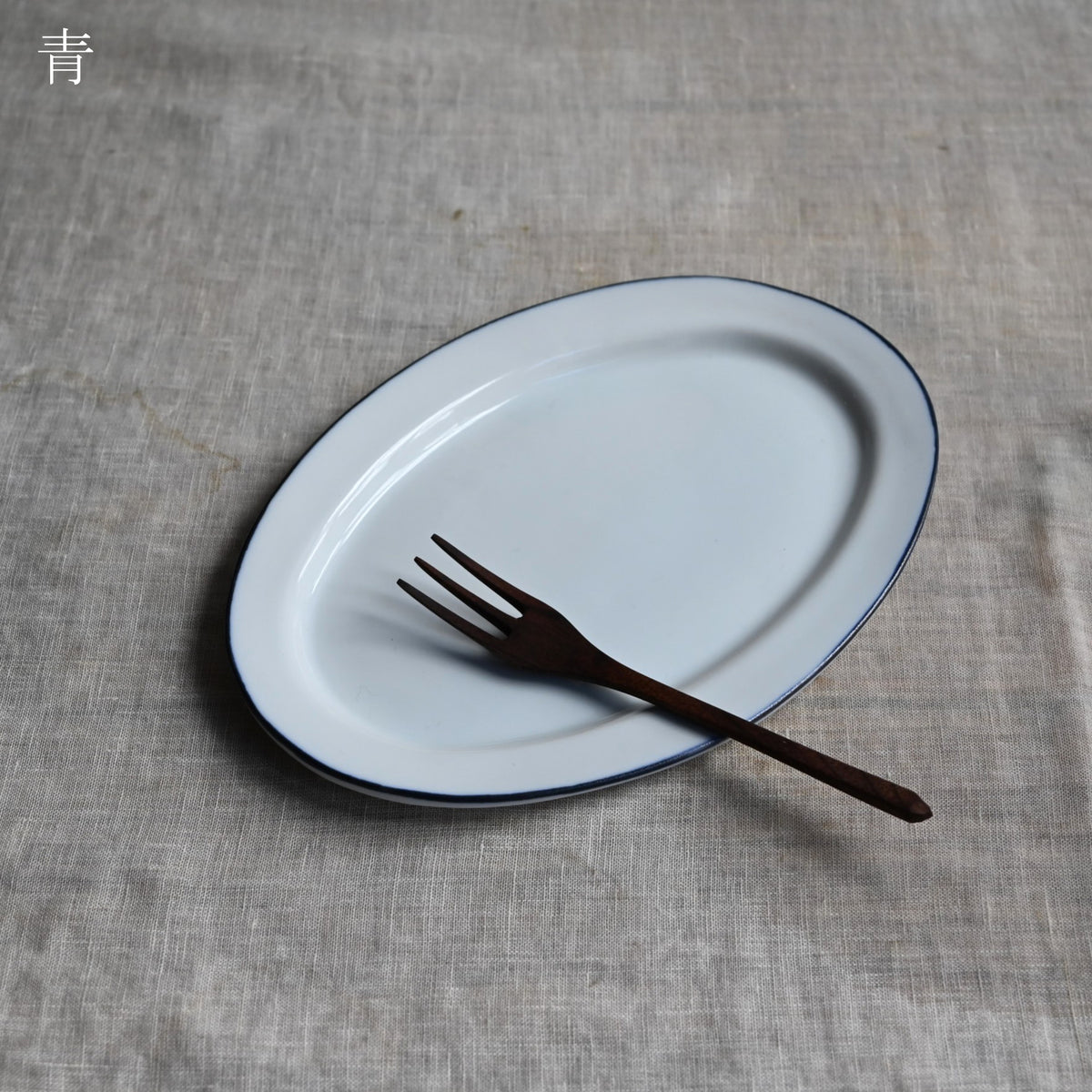 静岡県で制作される赤堀さん。琺瑯のような質感に、さりげないふちどりの色がアクセントに。懐かしさもありながら、すっきりとしたかたちは洗練された雰囲気。日々の食卓に新しい風を吹かせてくれるような器です。