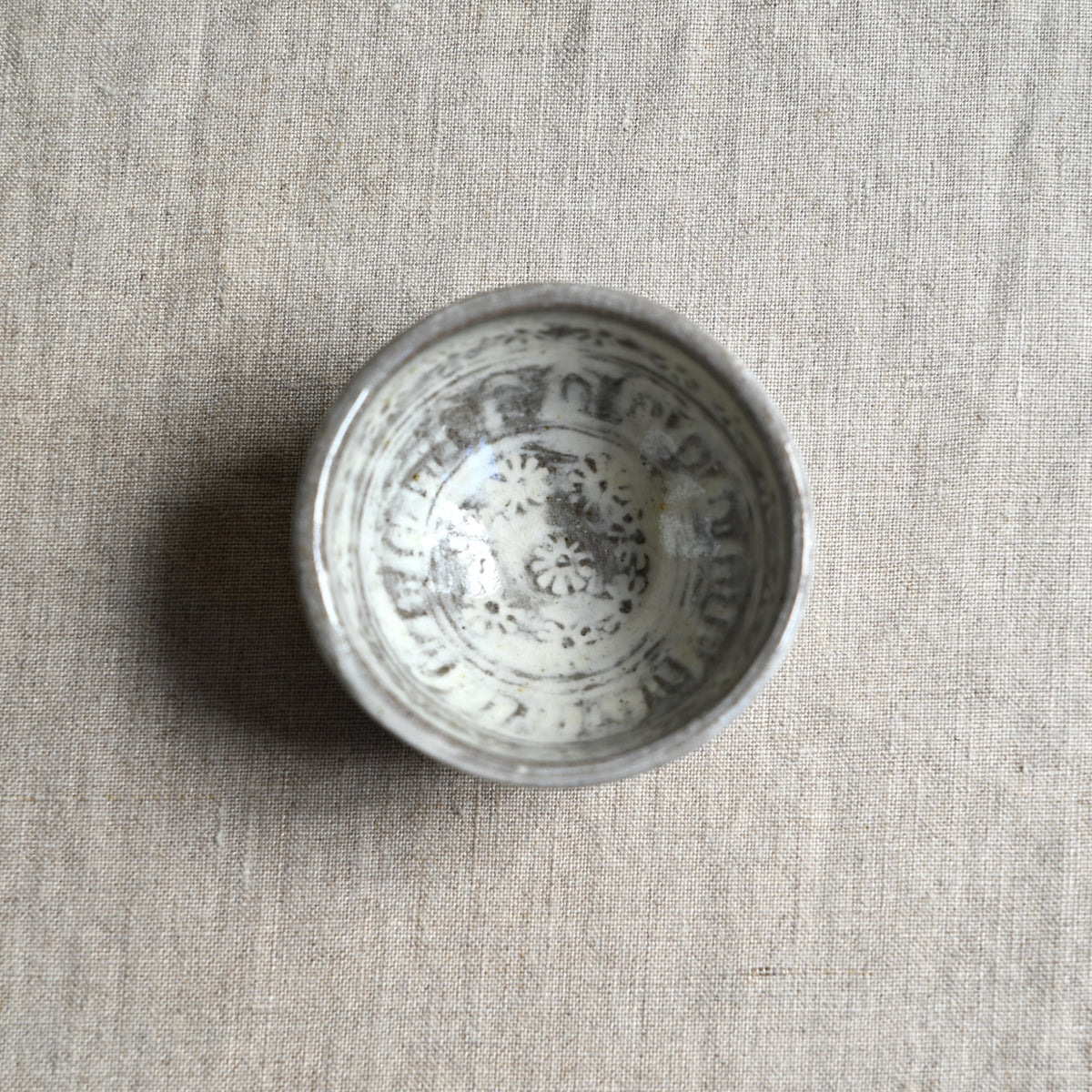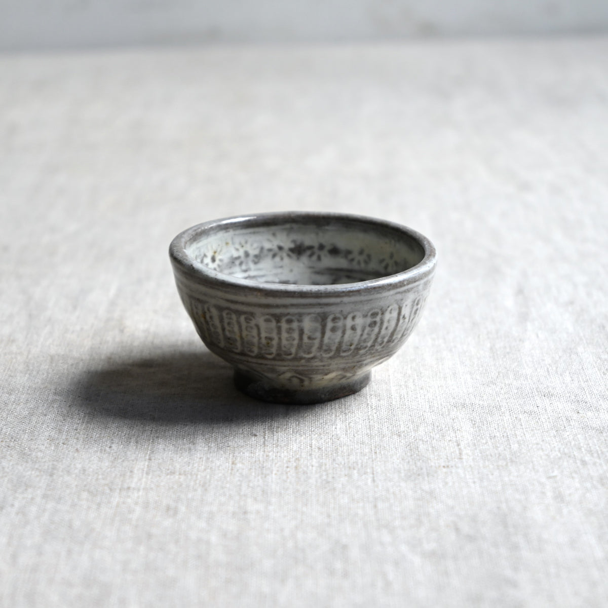 手作りの判子を使って丁寧に施された三島の紋様が可憐なぐい吞み。
