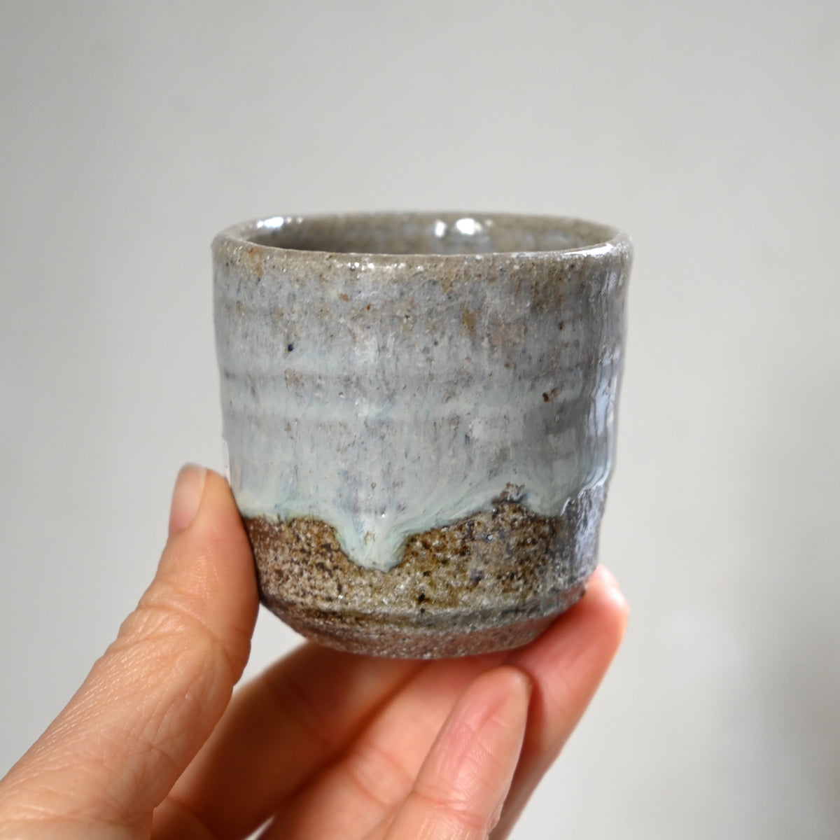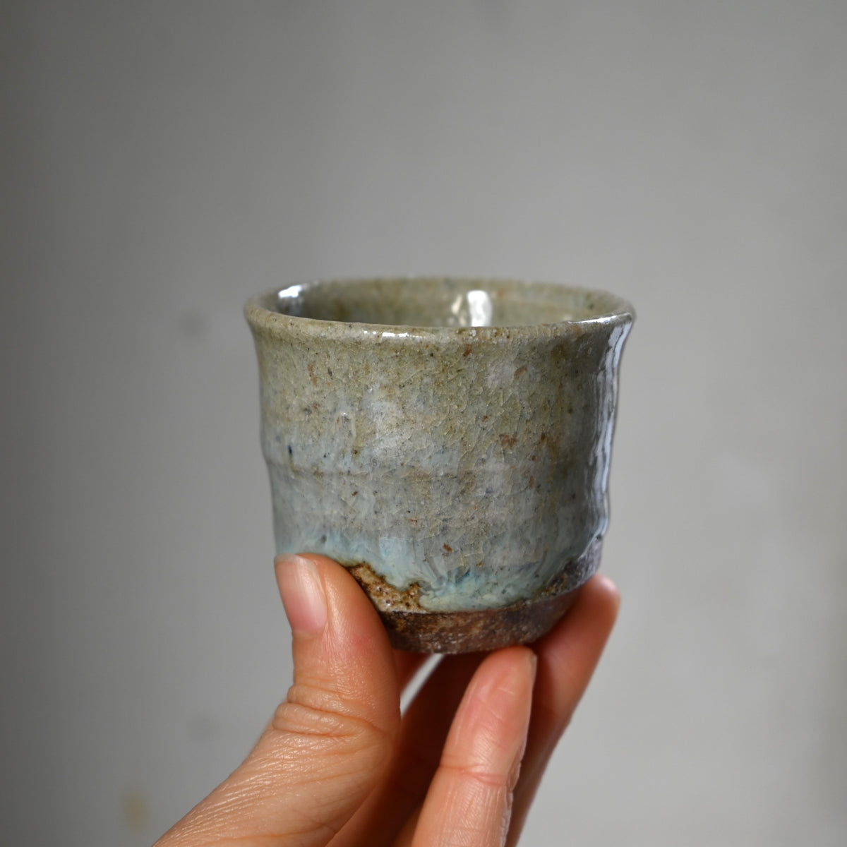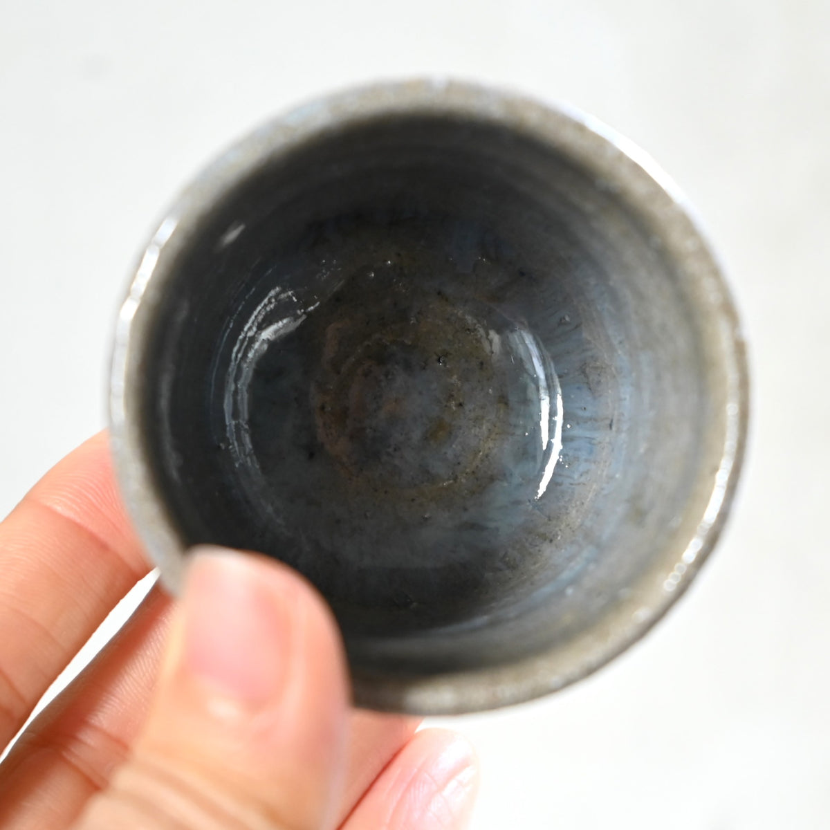 生地と釉薬のコントラストに温かみが感じられ、青みがかった内側が美しい斑ぐい吞み。