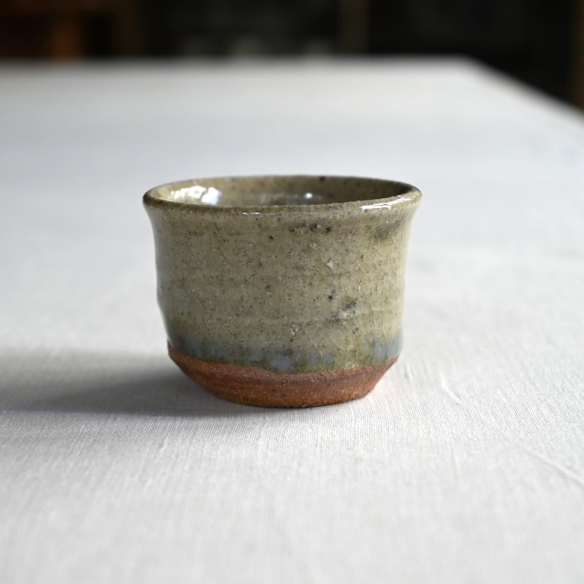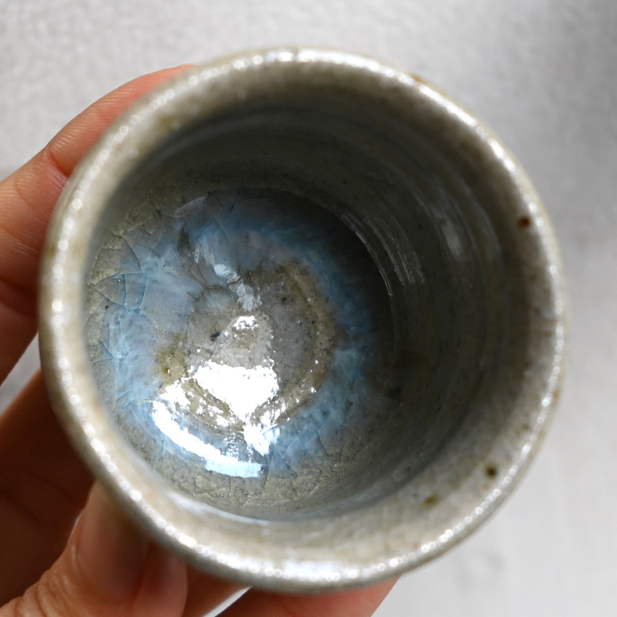生地と釉薬のコントラストに温かみが感じられ、青みがかった内側が美しい斑ぐい吞み。