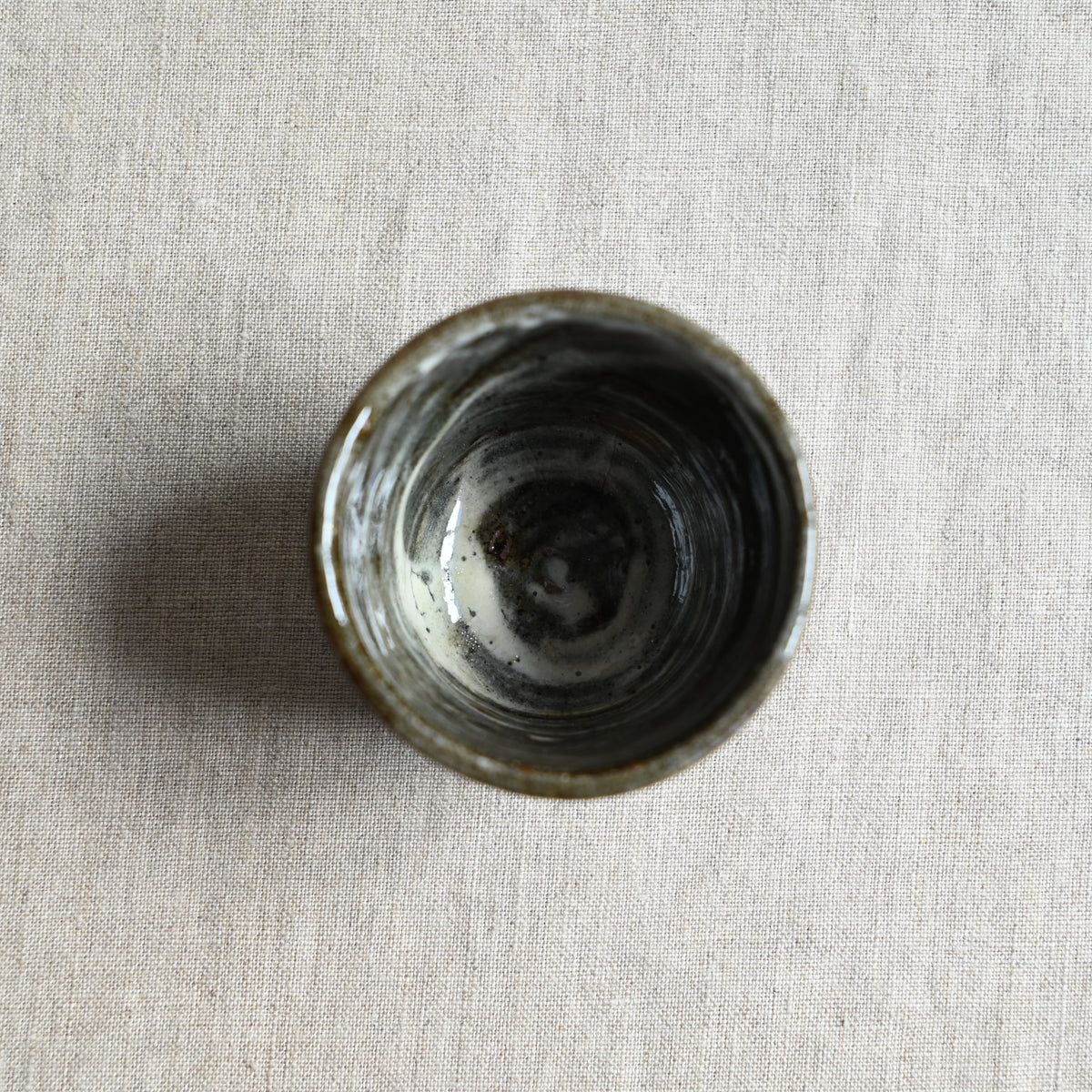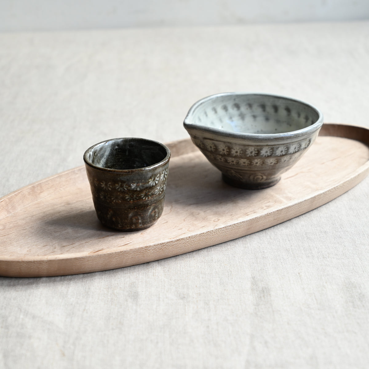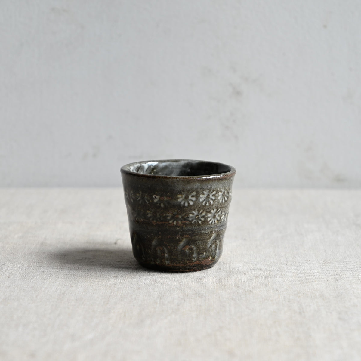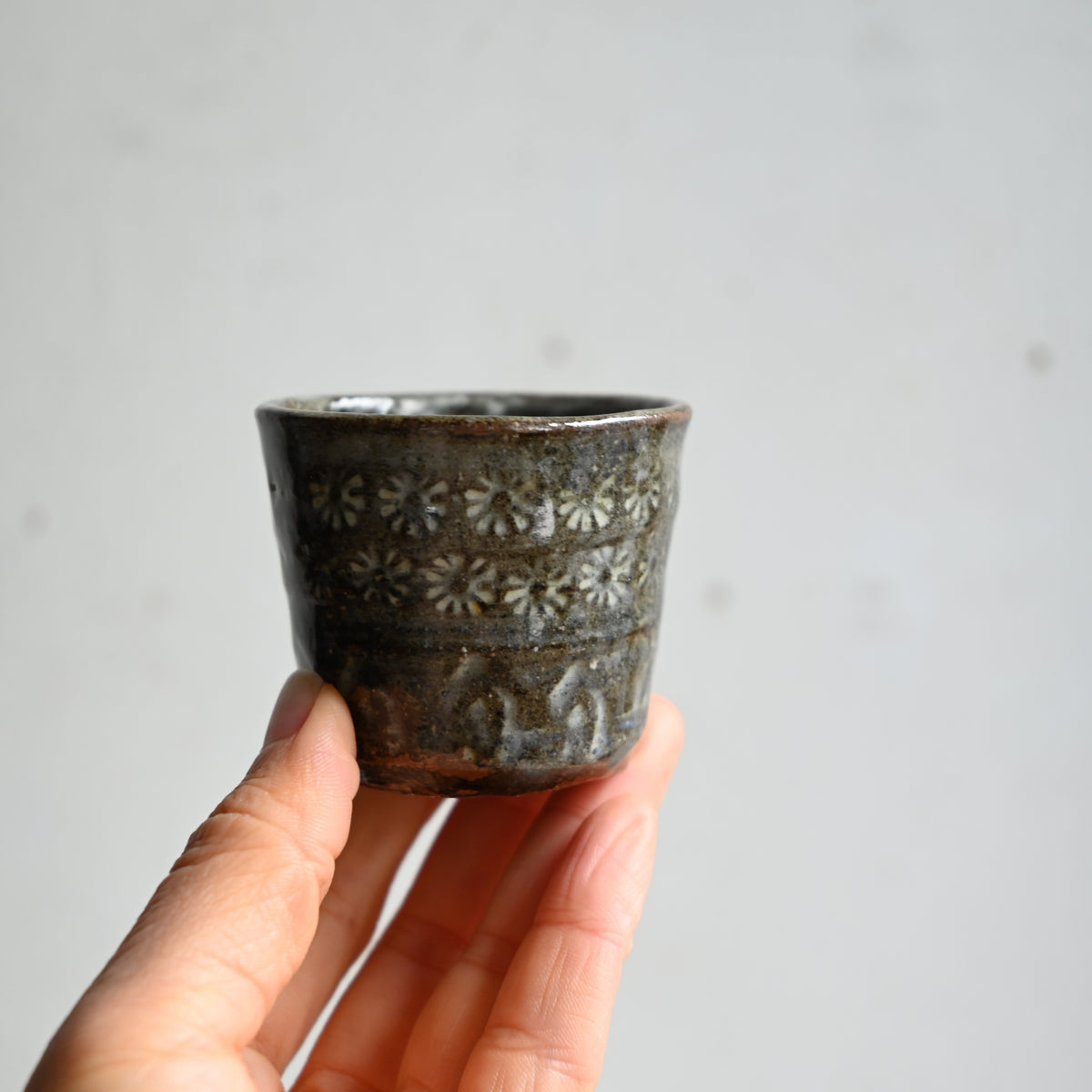 手作りの判子を使って丁寧に施された三島の紋様が可憐なぐい吞み。
